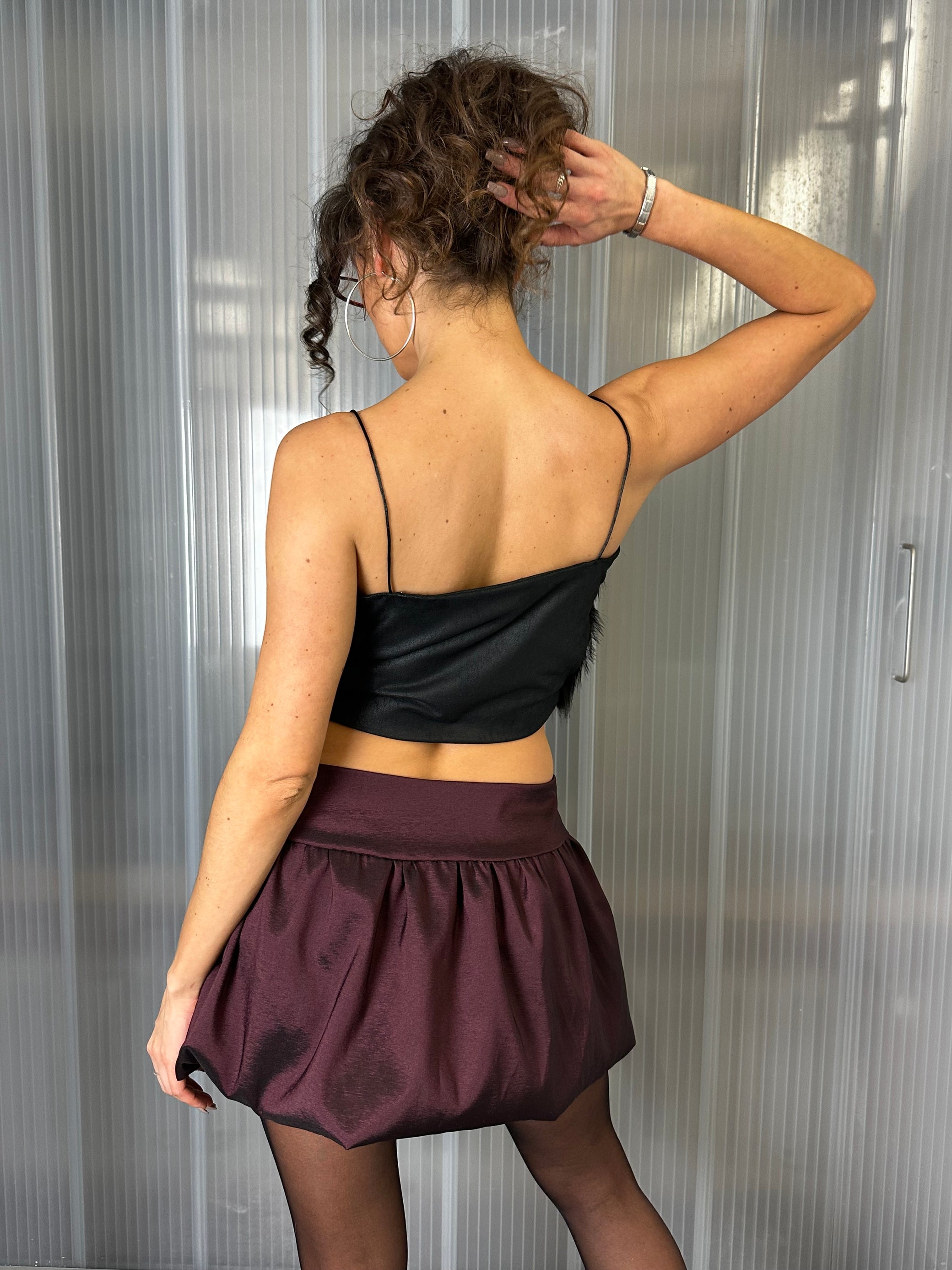 The unique balloon shape combines timeless sophistication with a playful, voluminous silhouette. Crafted from luxurious shiny taffeta in a deep aubergine black shade and fastened with invisible zipper on the left. Our fabric is sourced in Berlin from local suppliers.