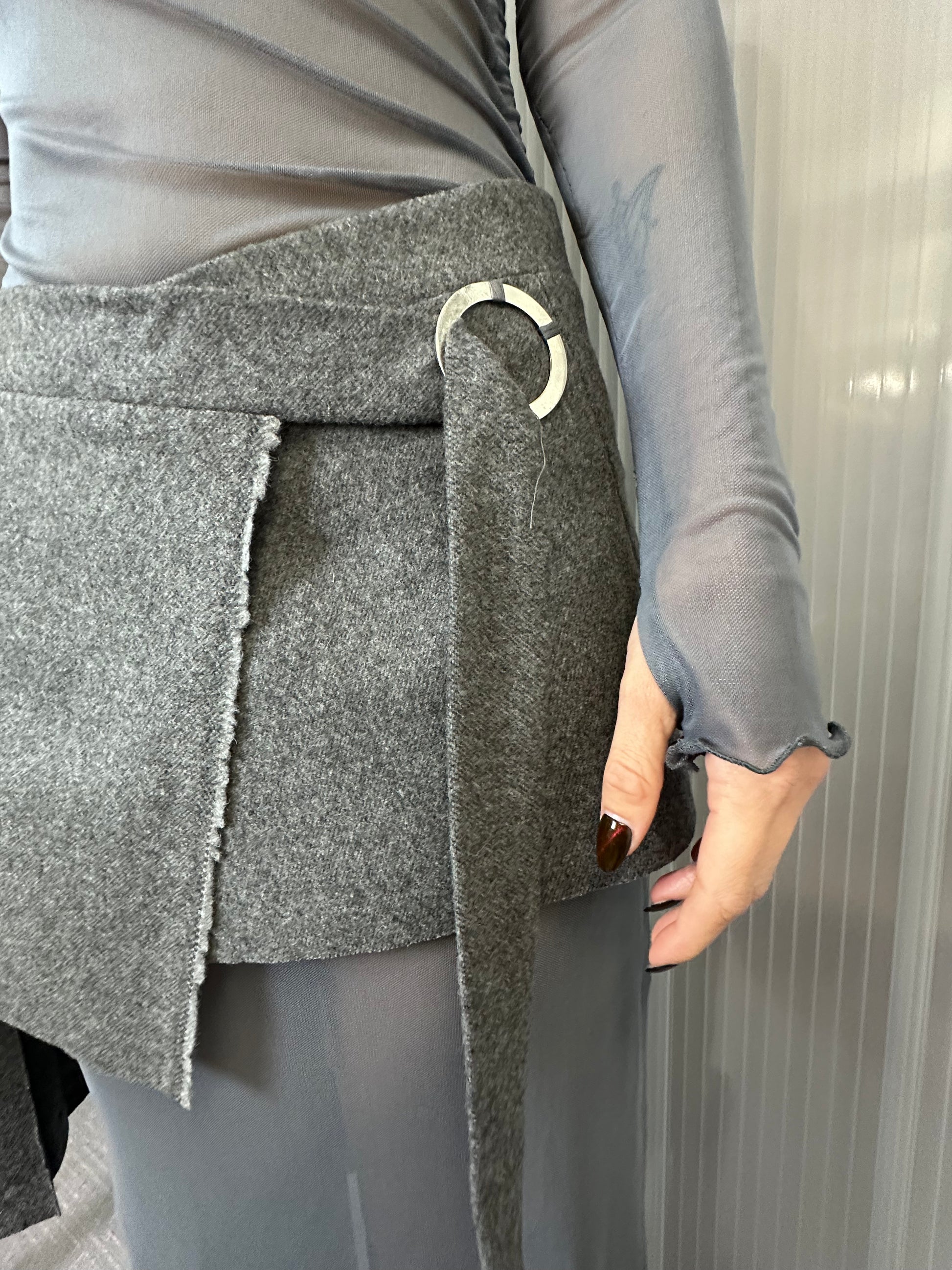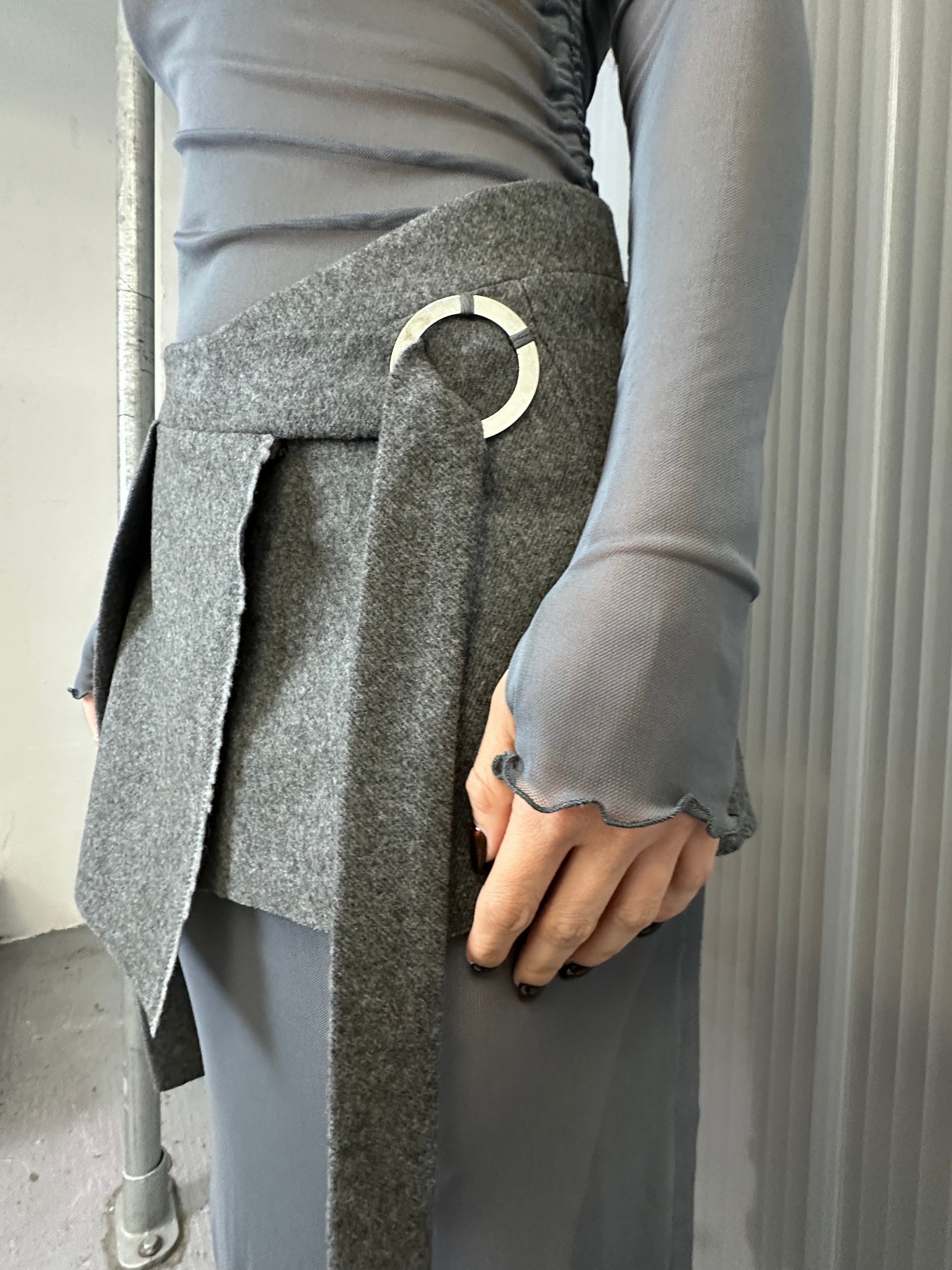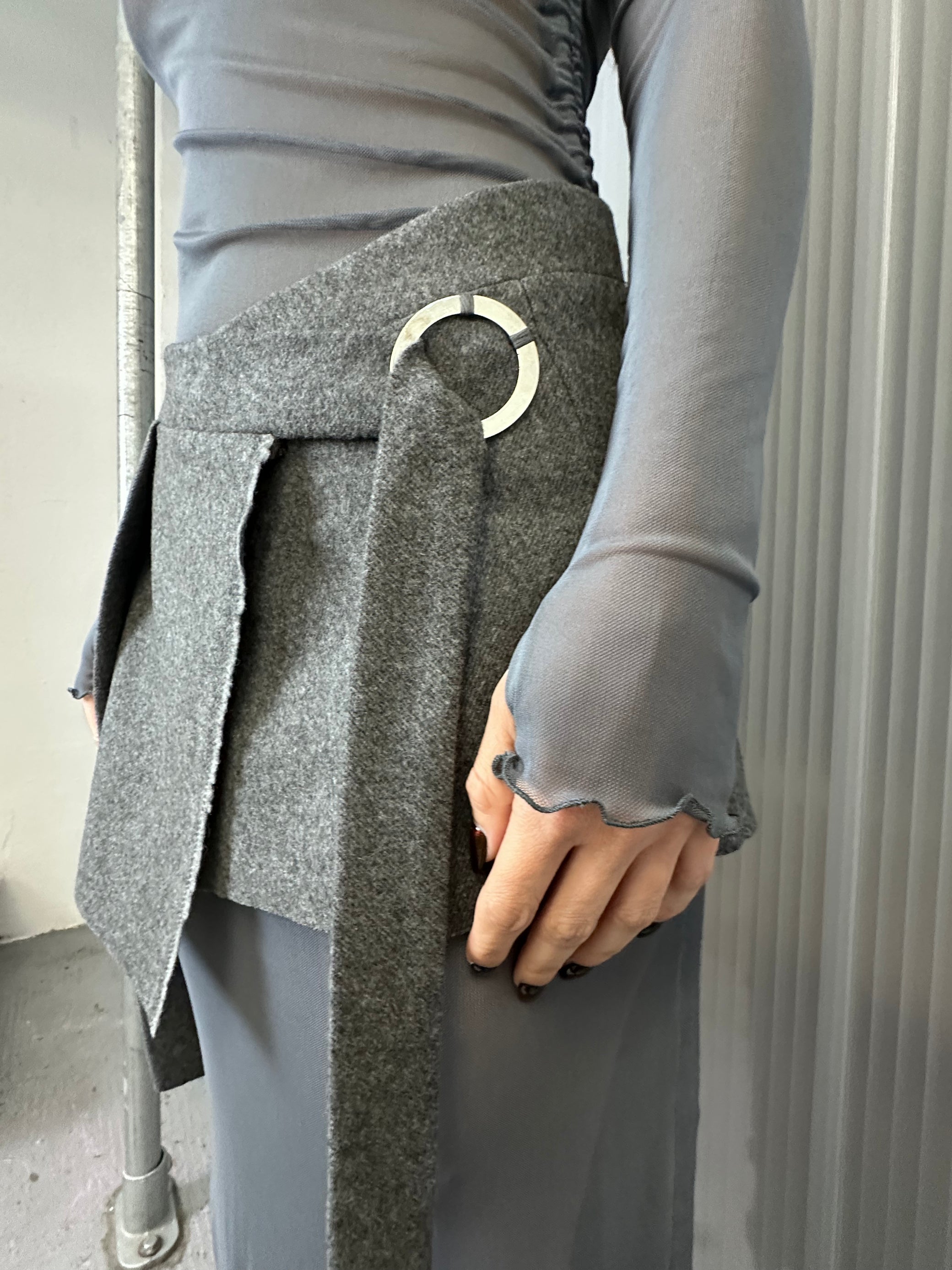 Asymmetric low-waist pleated skirt, featuring a front ring fastening for distinctive touch. Crafted from high-quality wool sourced in Berlin from trusted suppliers.