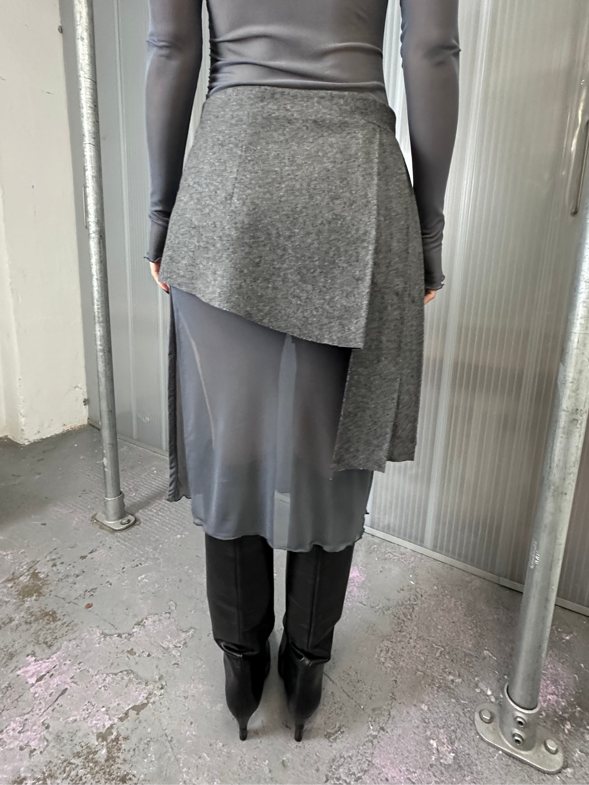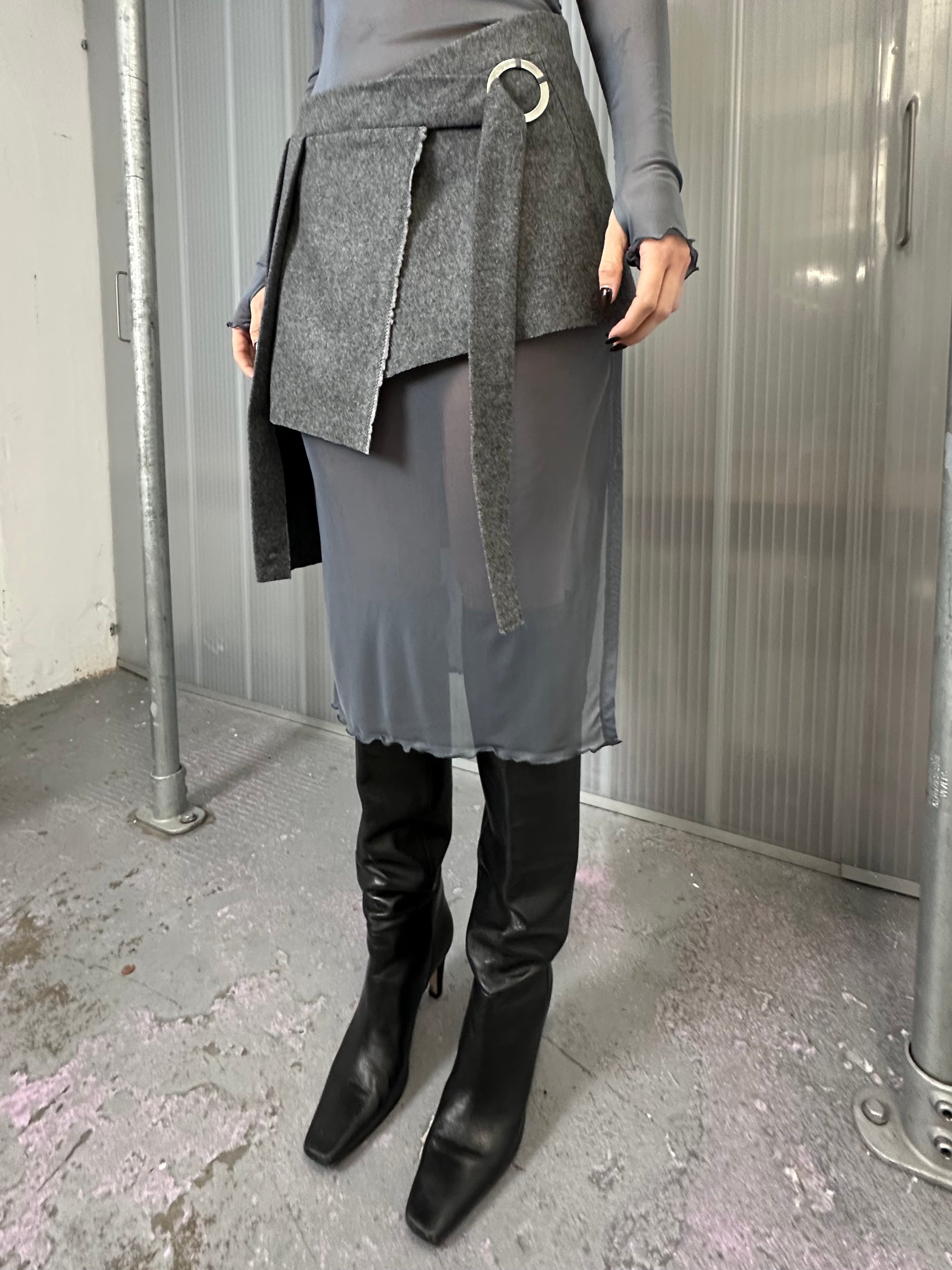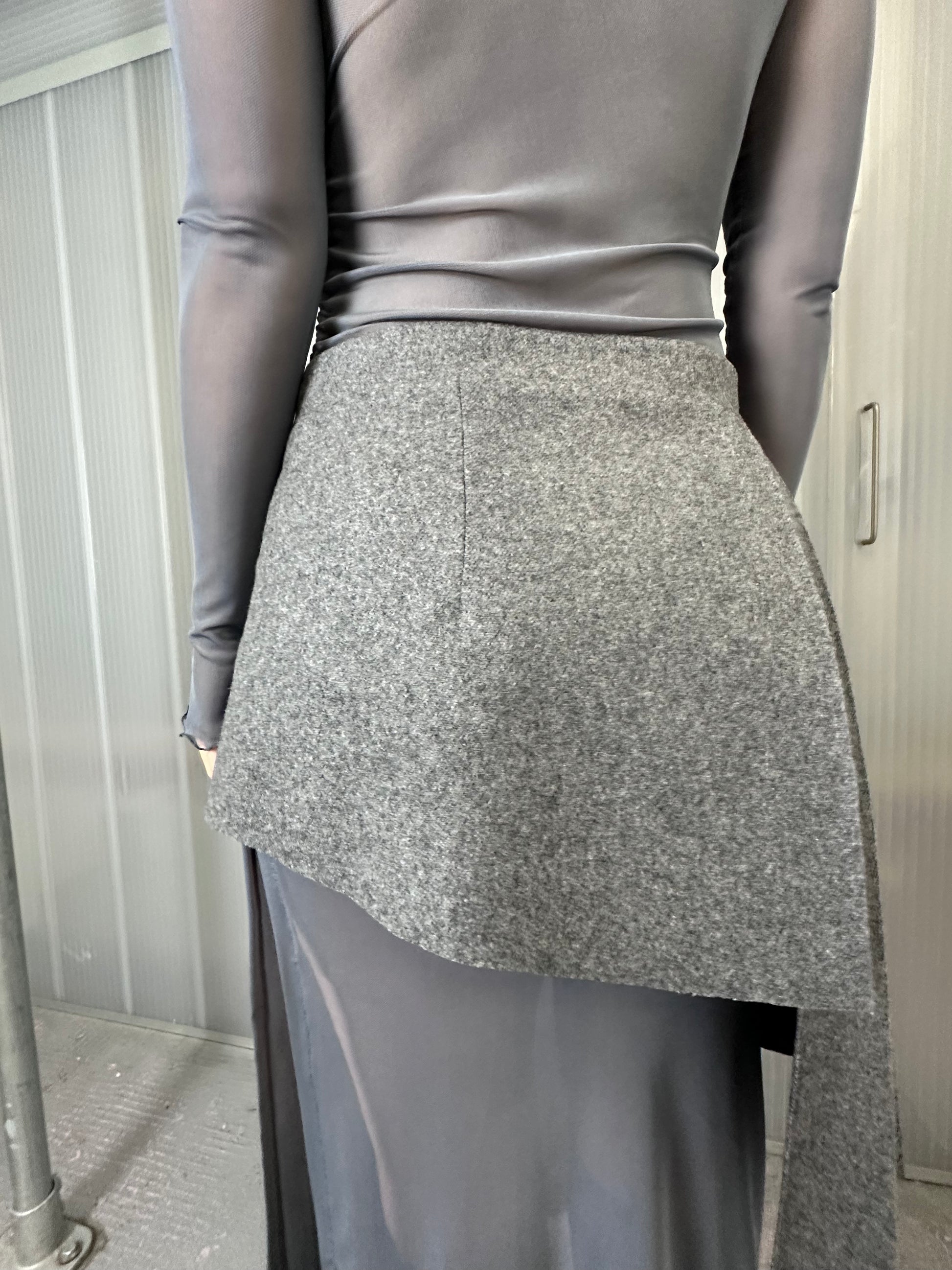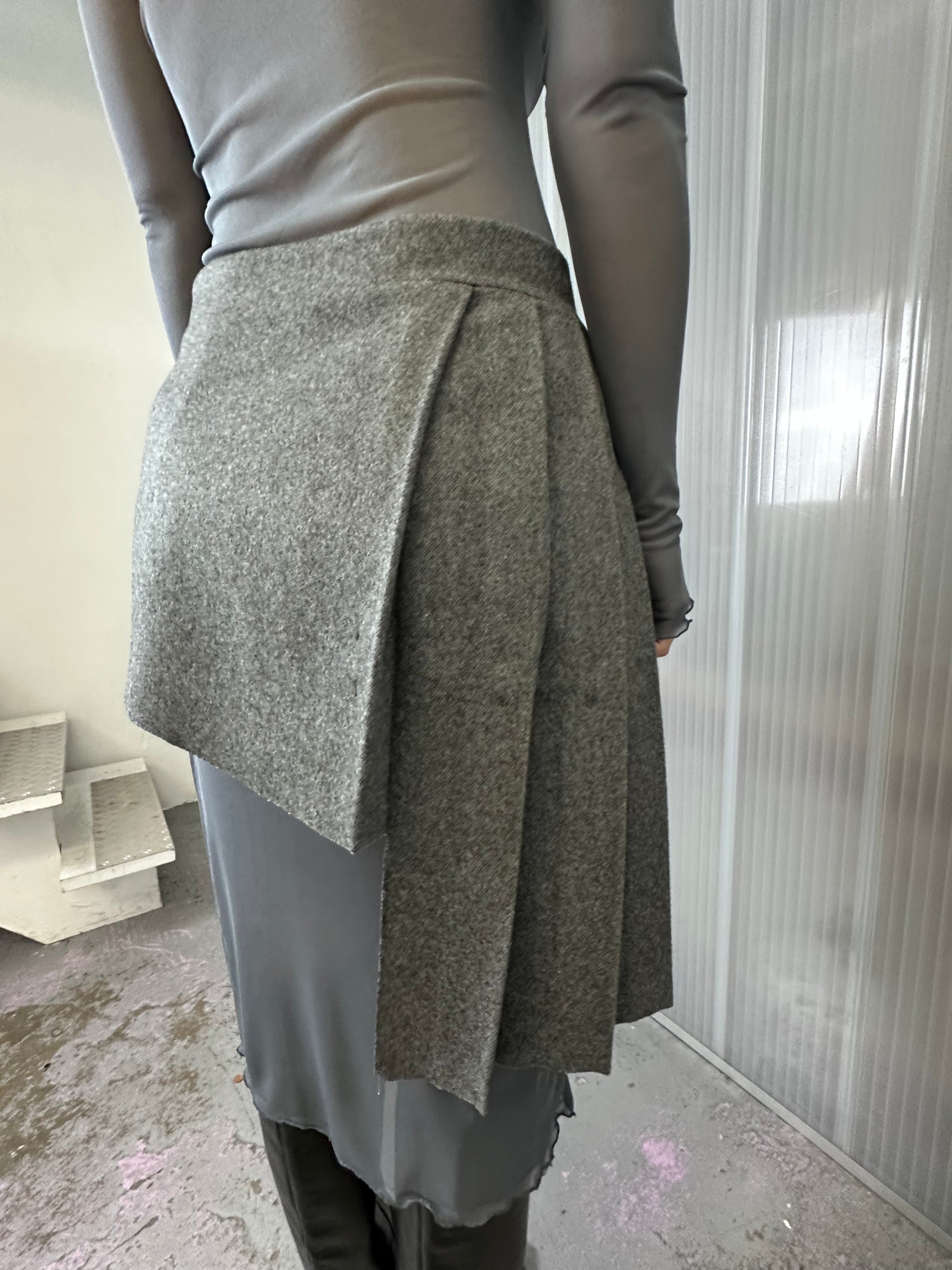 Asymmetric low-waist pleated skirt, featuring a front ring fastening for distinctive touch. Crafted from high-quality wool sourced in Berlin from trusted suppliers.