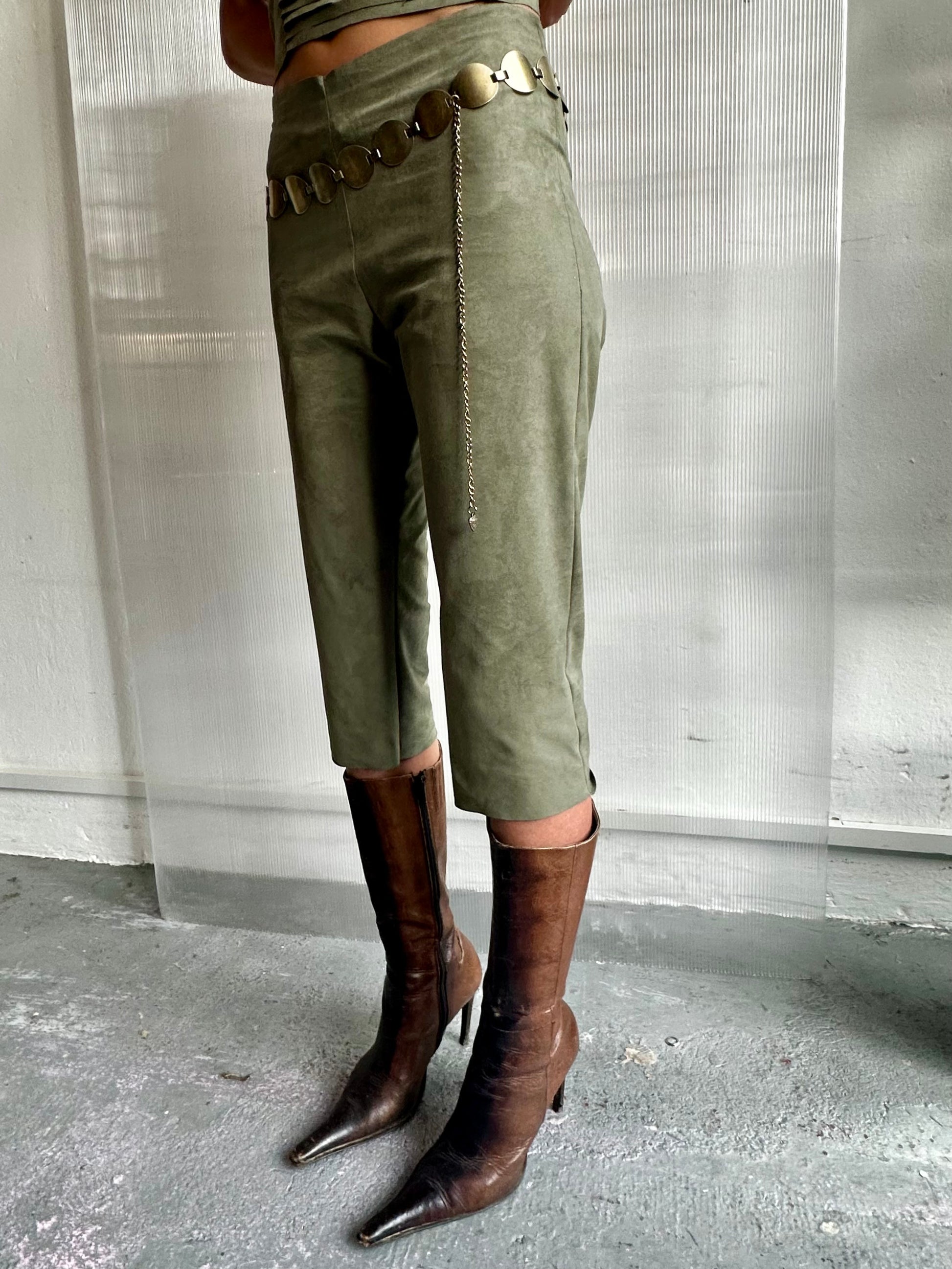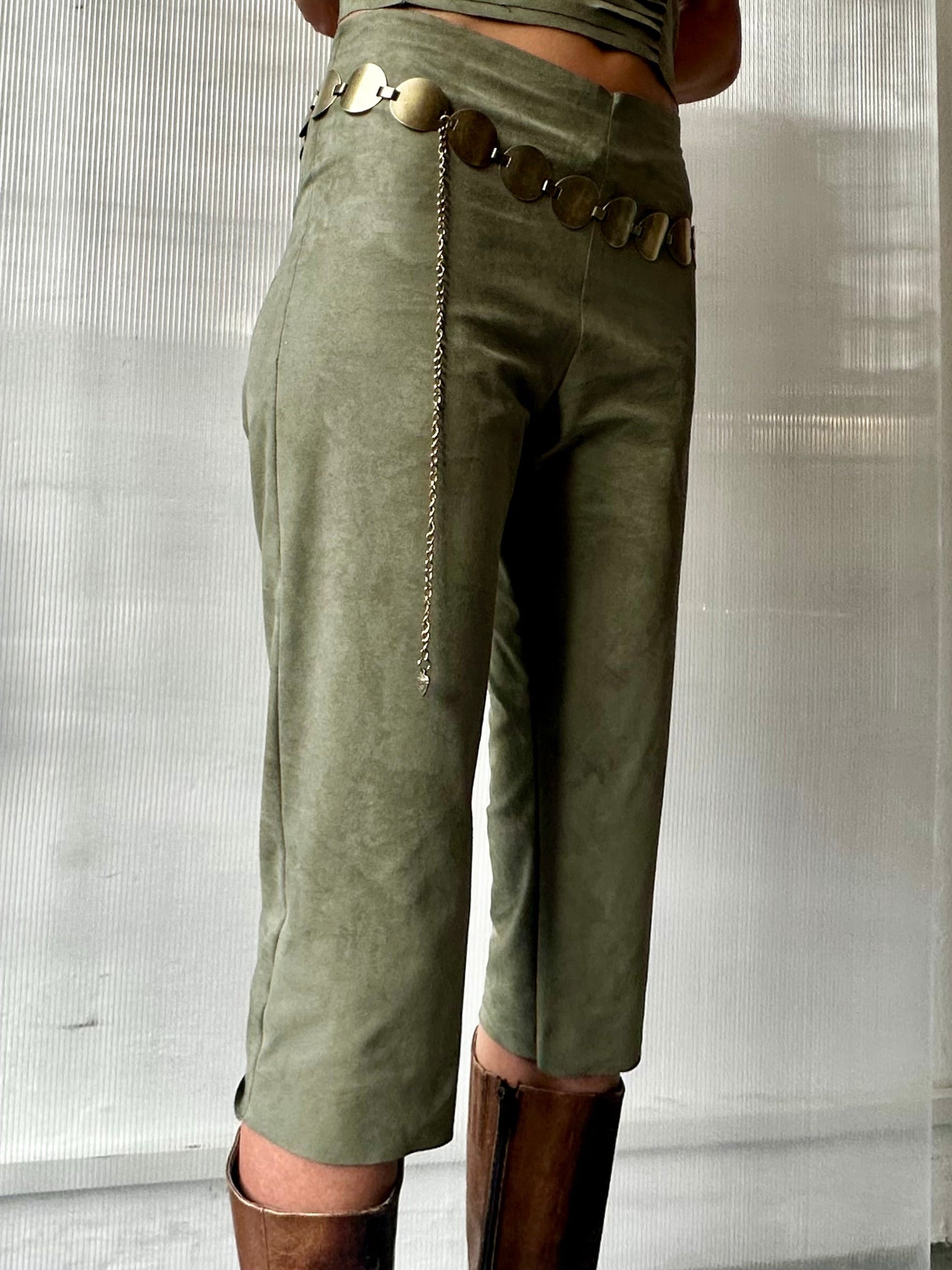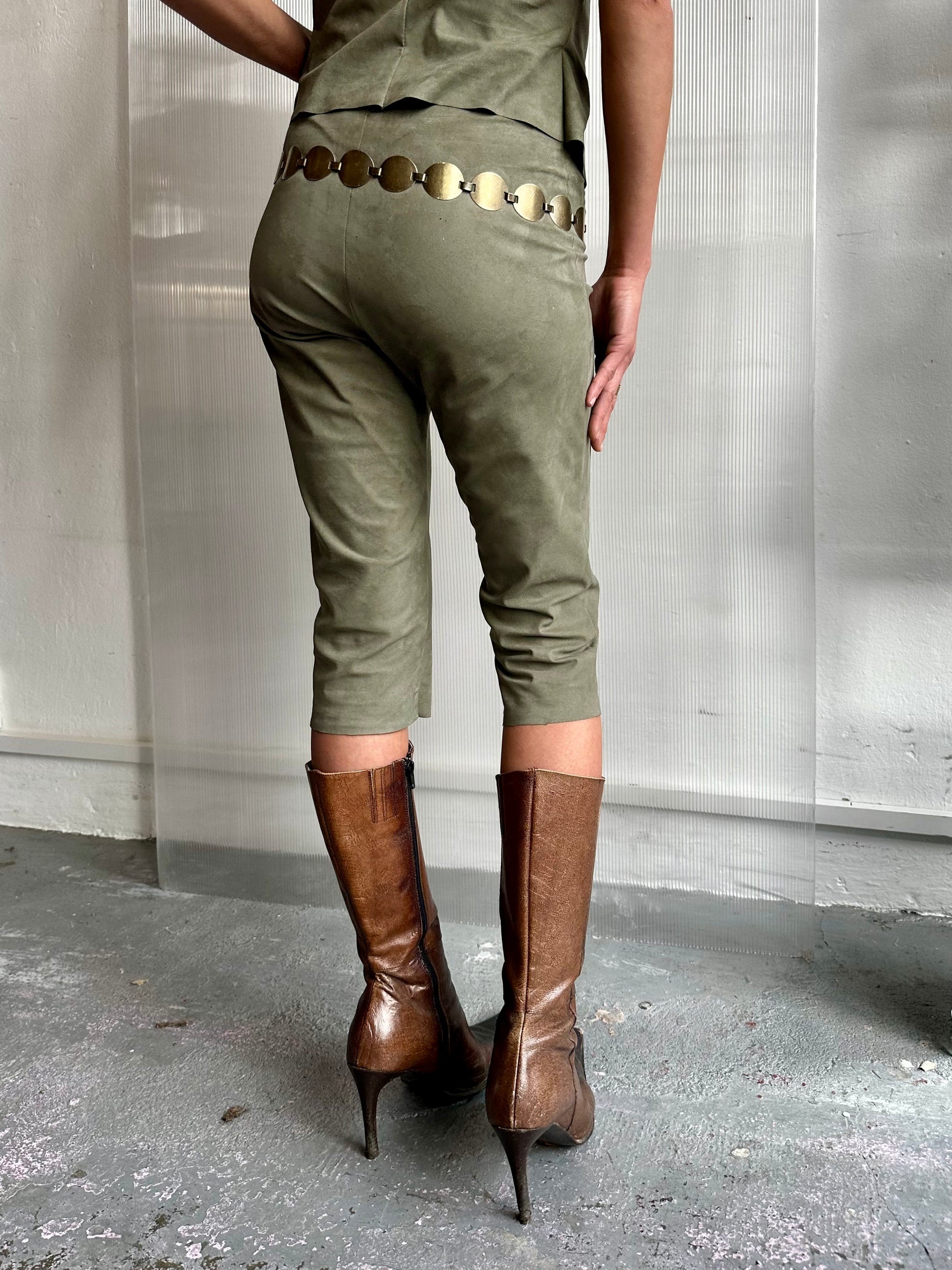 These olive green capri pants are made from soft faux suede, locally sourced in Berlin. With a sleek cropped fit and a smooth finish, they offer a refined yet comfortable look. Versatile and easy to style, they transition effortlessly from casual to dressy. Thoughtfully crafted with quality and sustainability in mind.