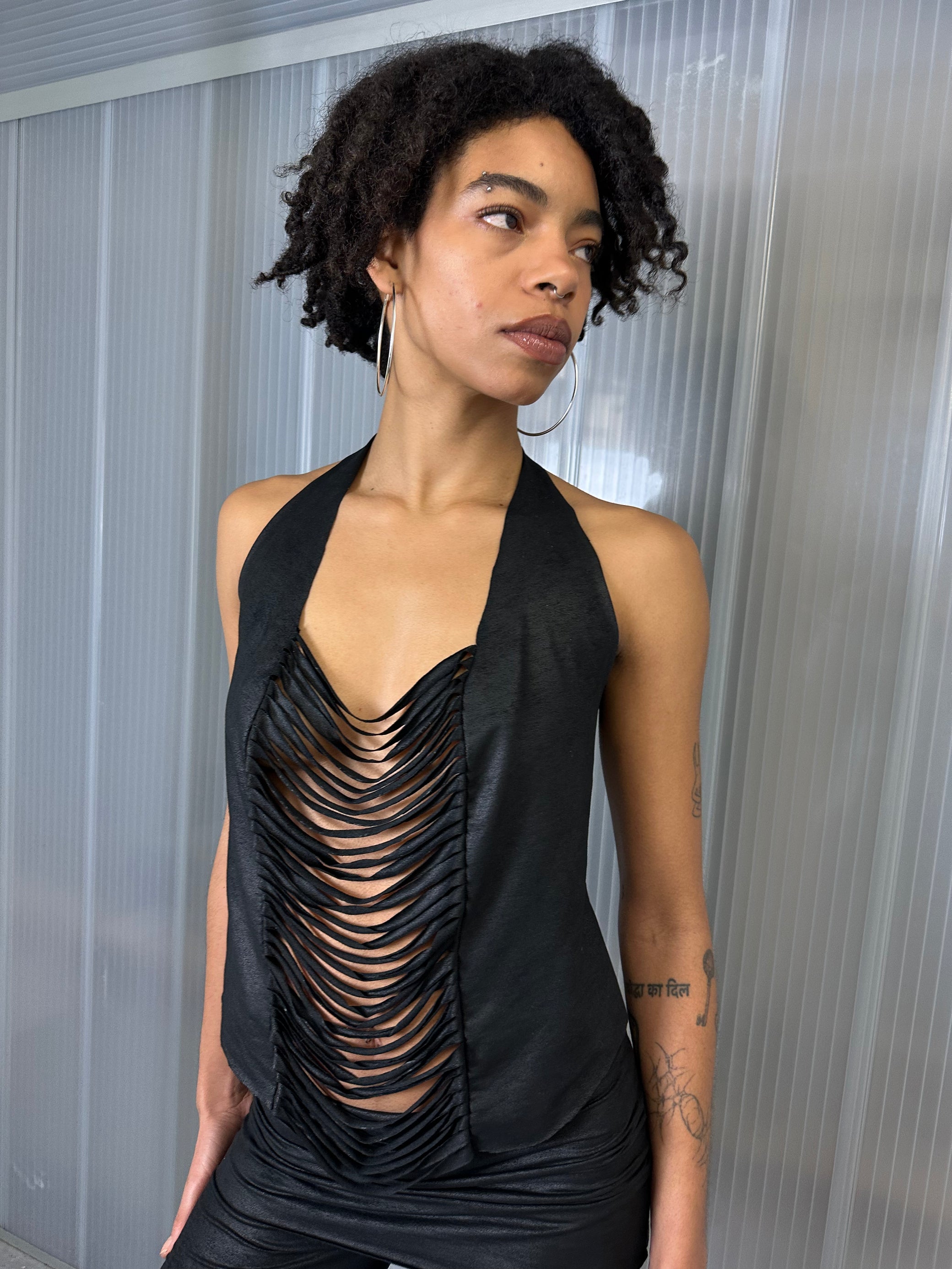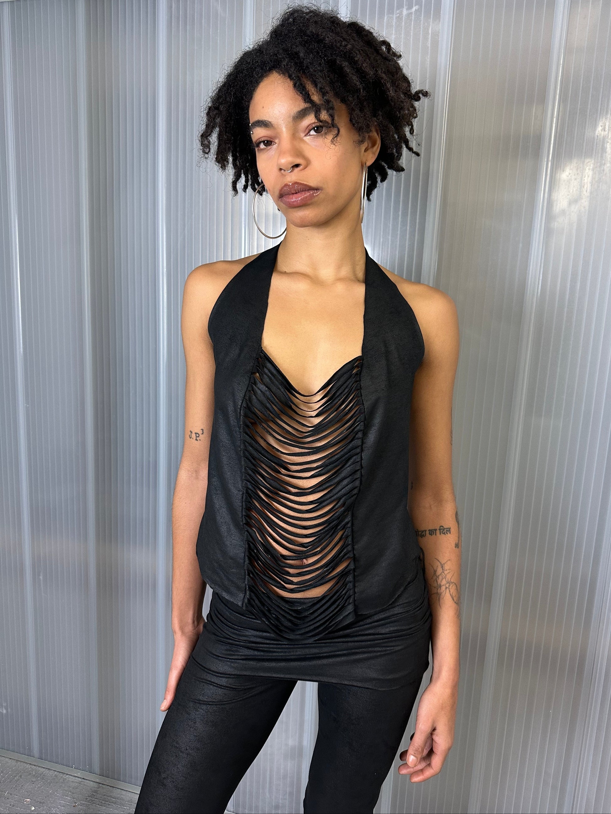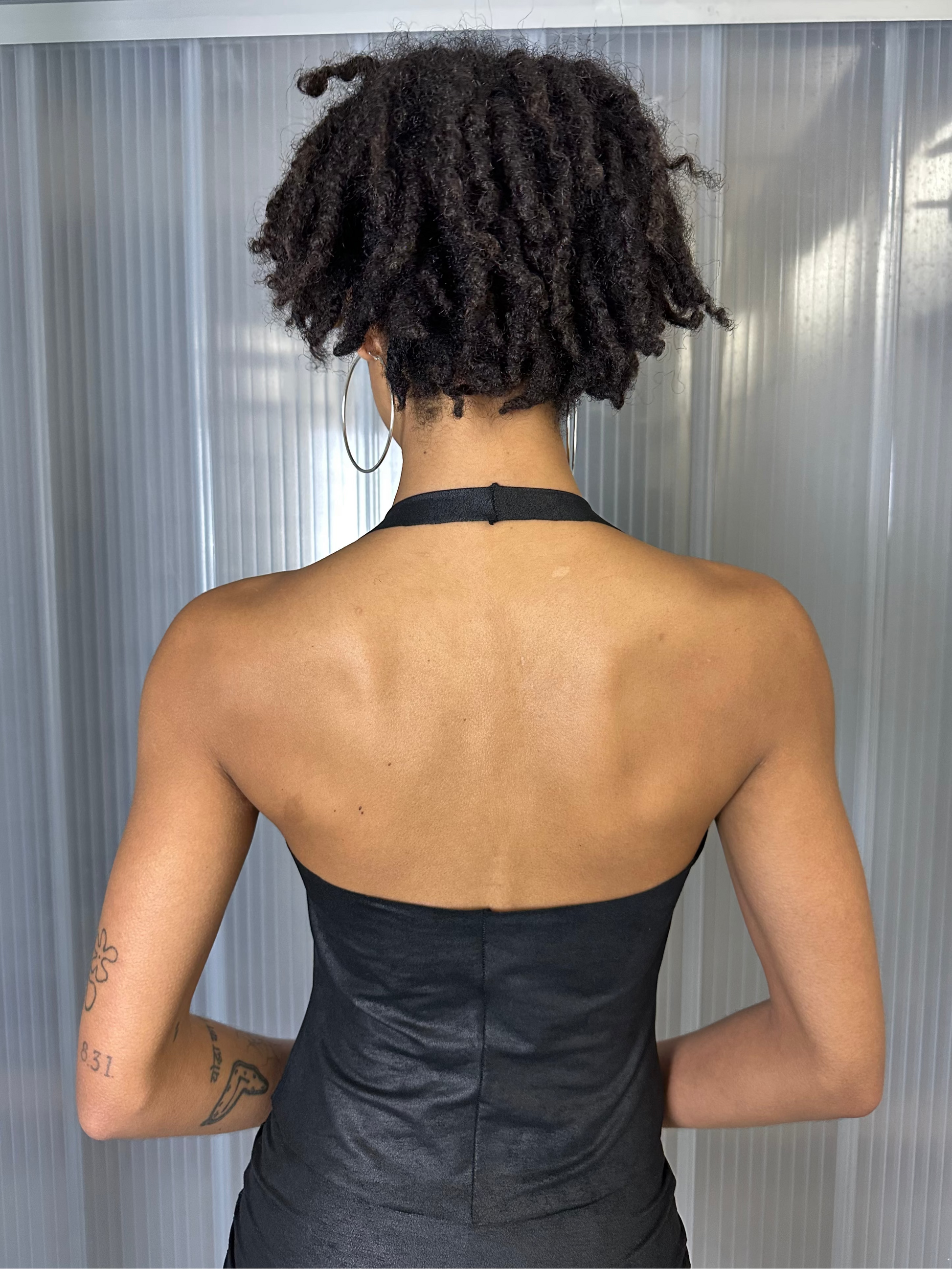Black halter top with front cut-out details, crafted from soft faux suede locally sourced in Berlin. Designed for a sleek, cropped fit with a smooth finish, it combines style and comfort effortlessly. Made with care, focusing on quality and sustainability.