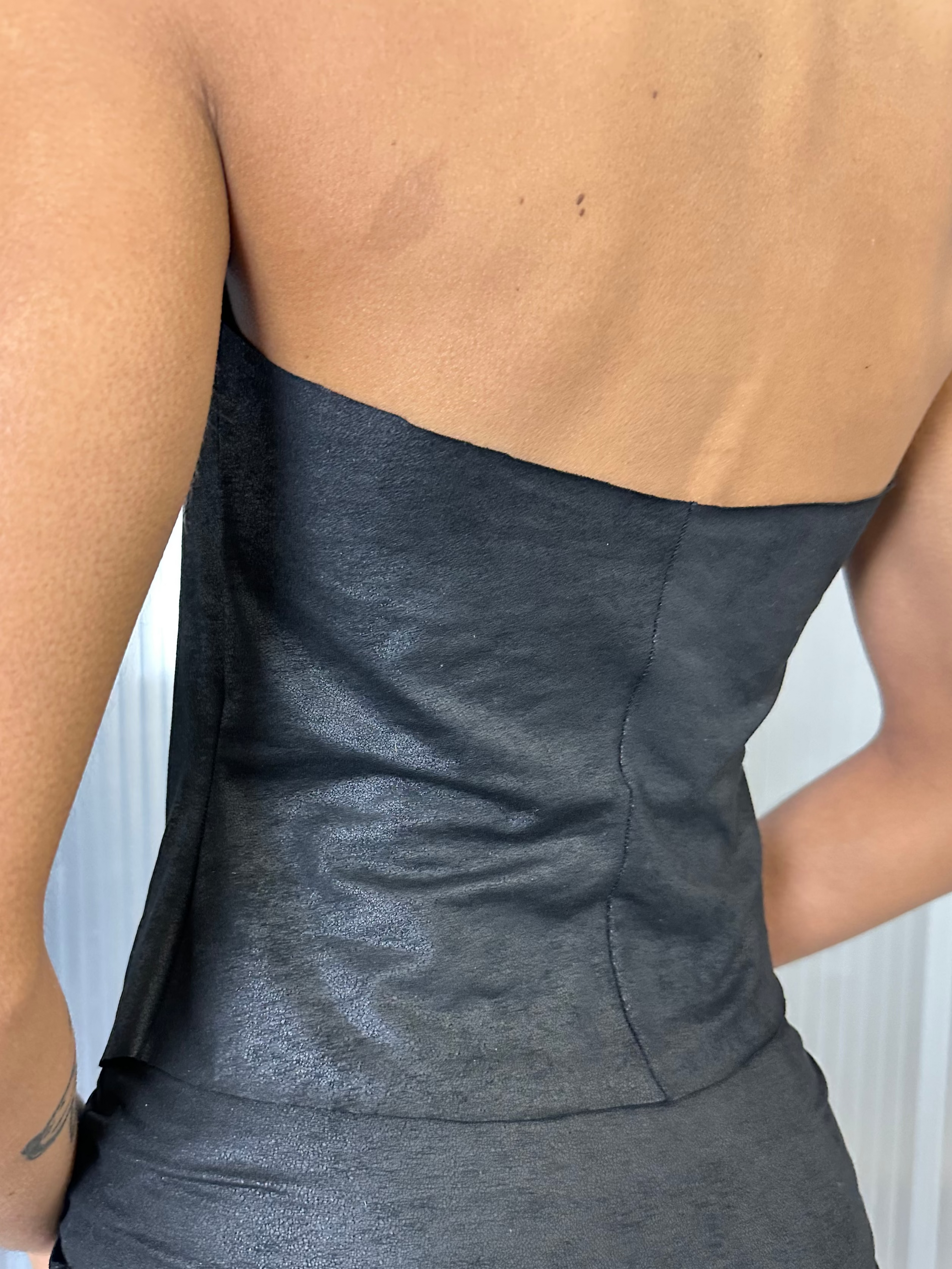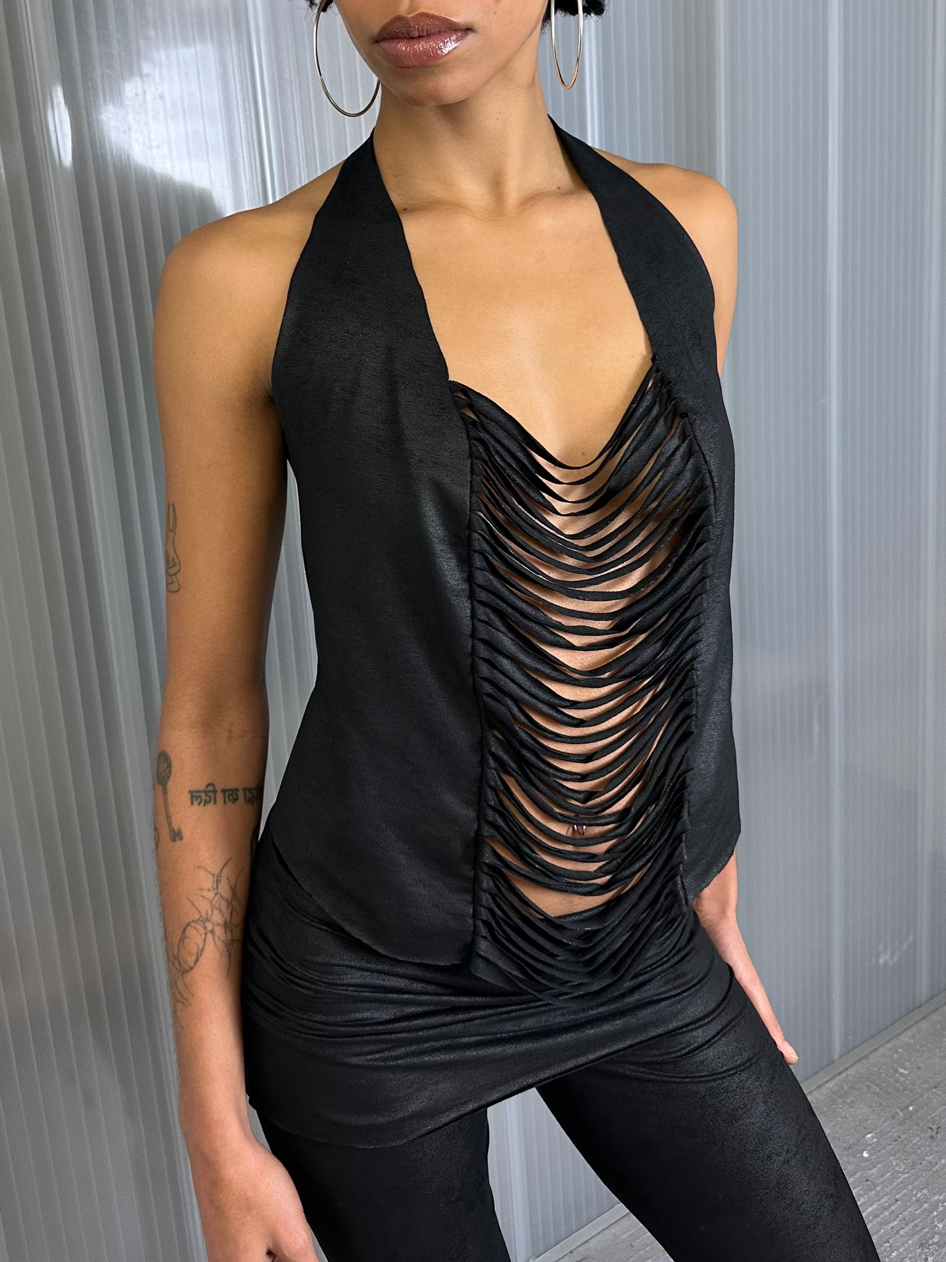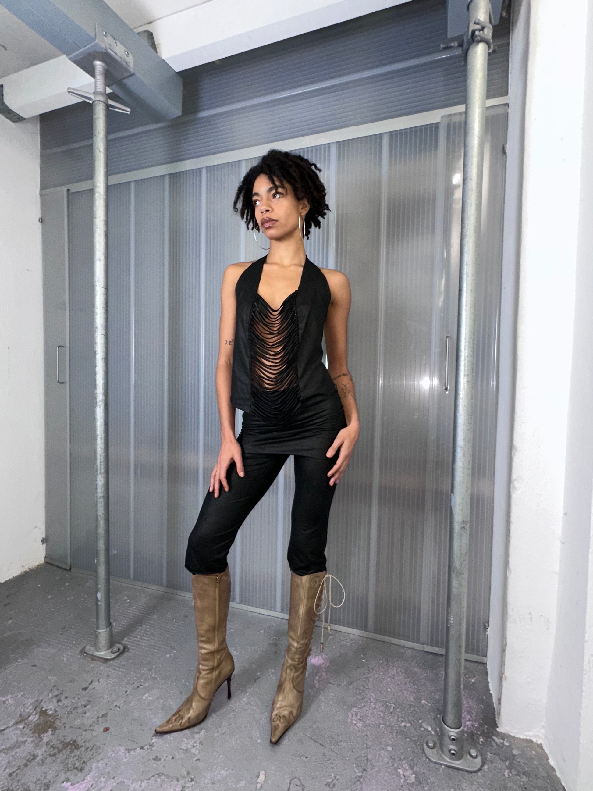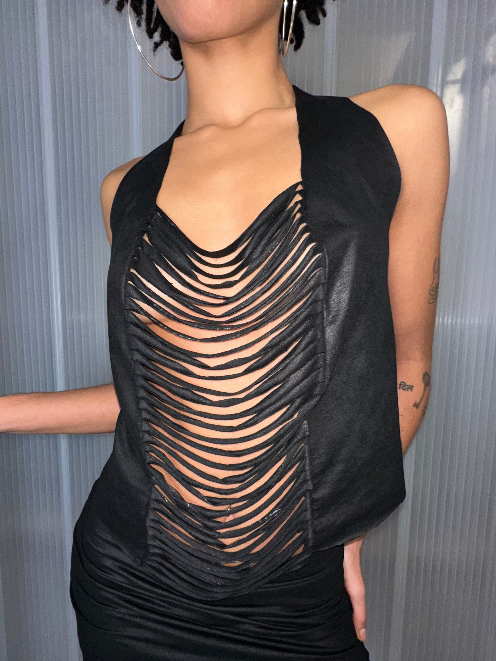 Black halter top with front cut-out details, crafted from soft faux suede locally sourced in Berlin. Designed for a sleek, cropped fit with a smooth finish, it combines style and comfort effortlessly. Made with care, focusing on quality and sustainability.