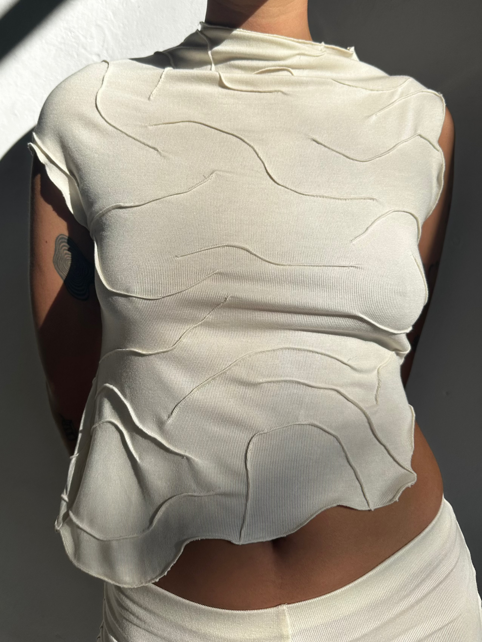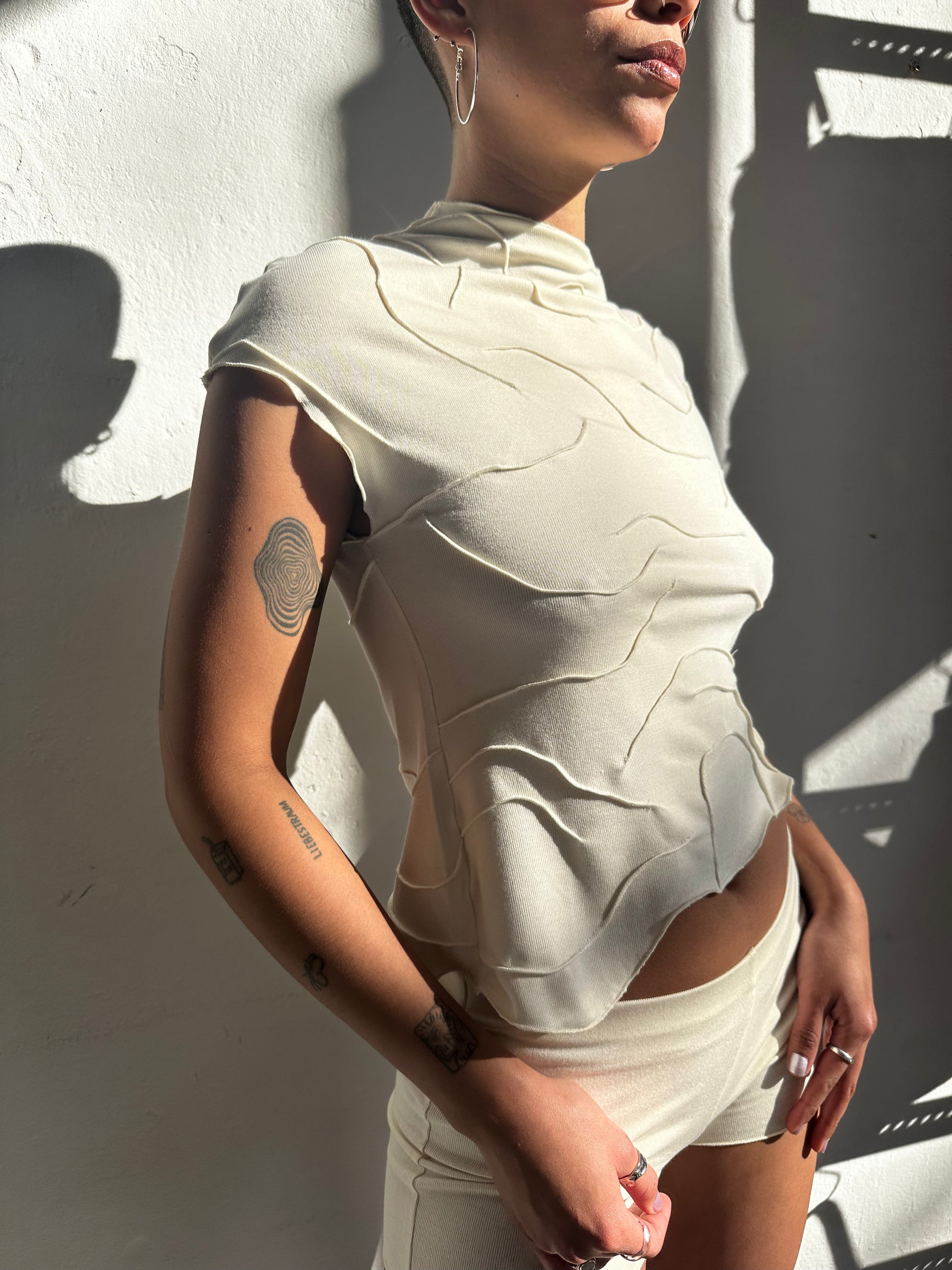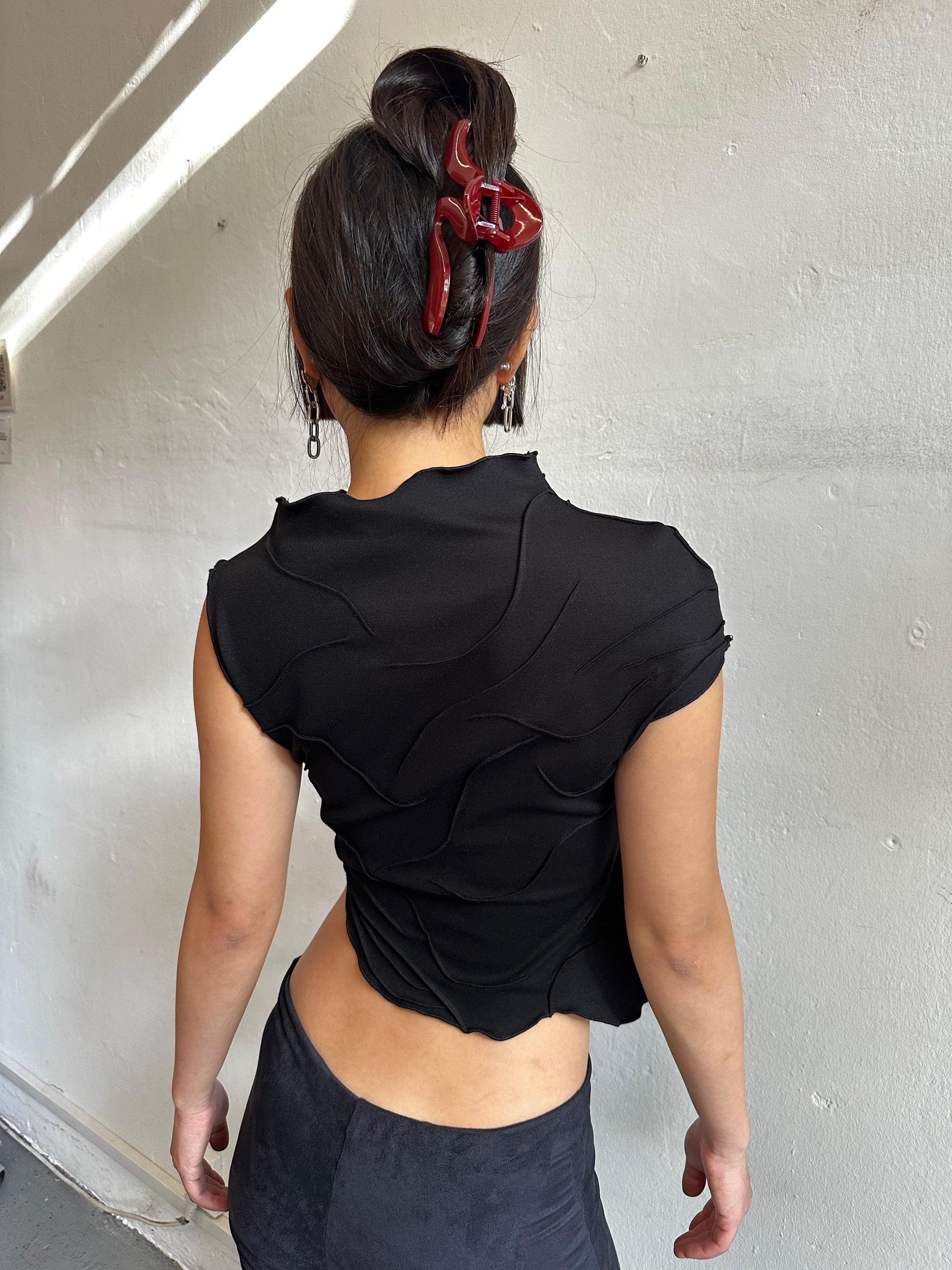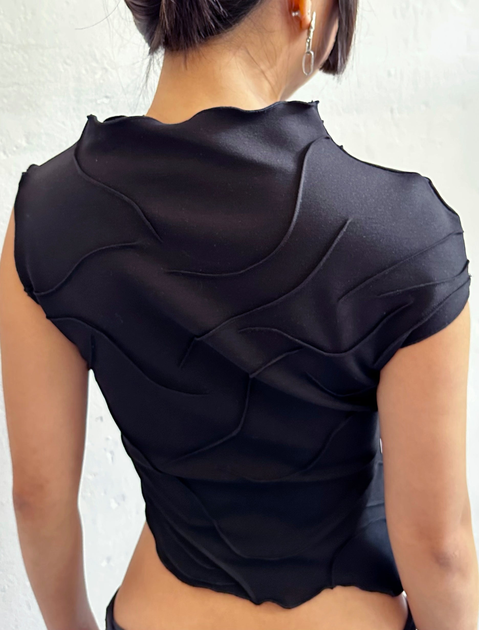 Black/ off-white asymmetric top featuring embossed seams crafted from ribbed jersey, locally sourced in Berlin. Each piece is unique so embossed seams may vary.
