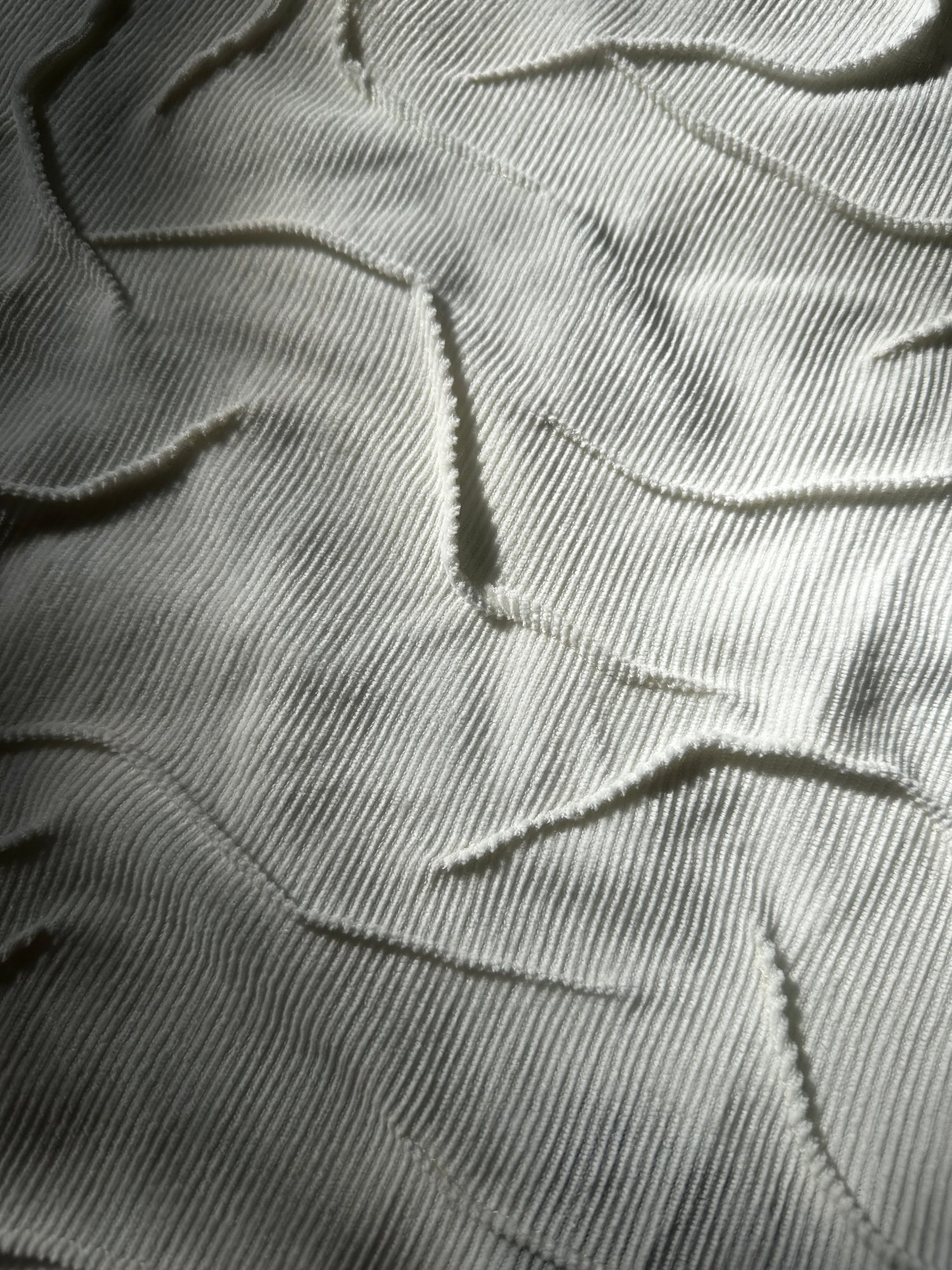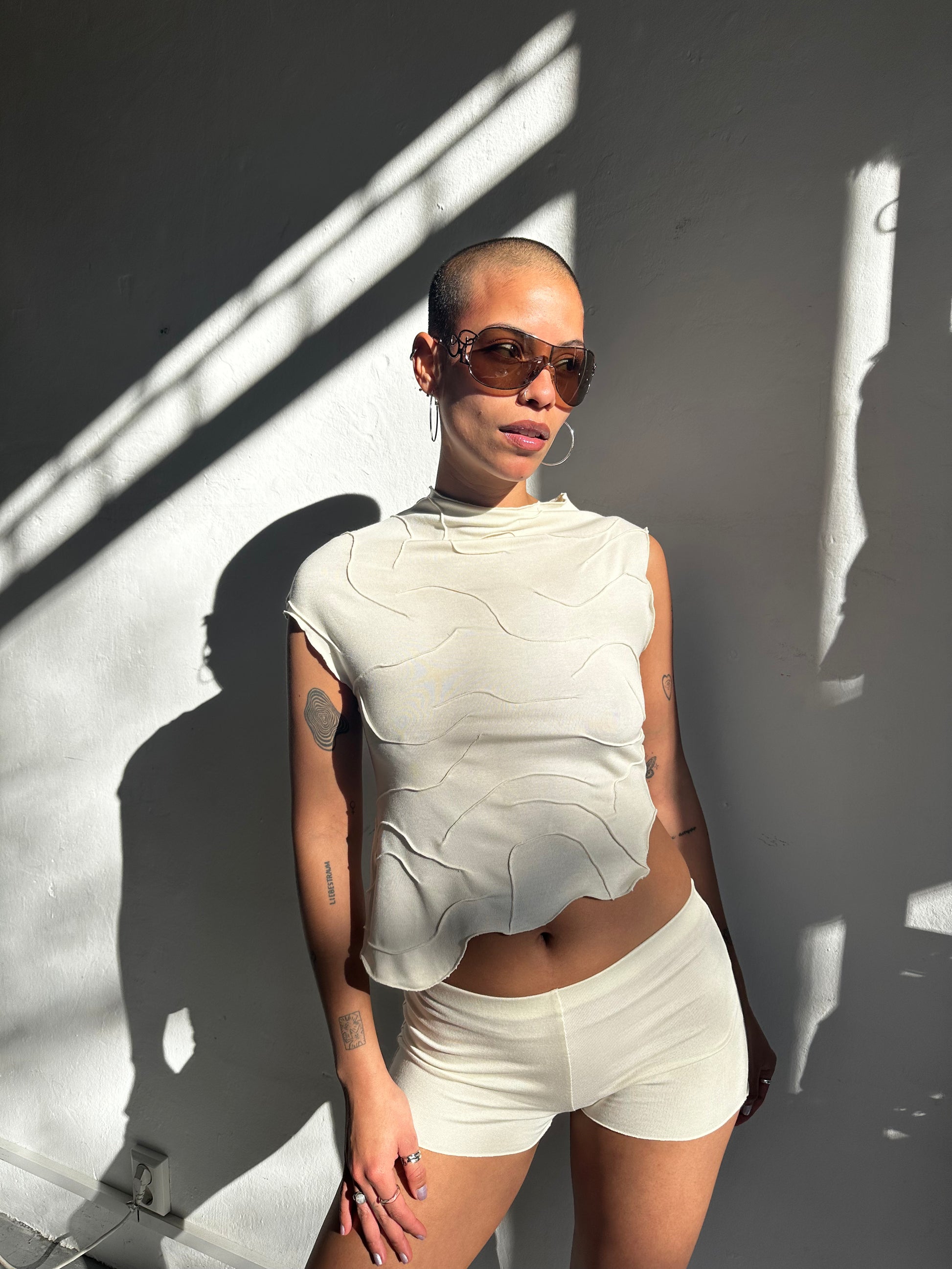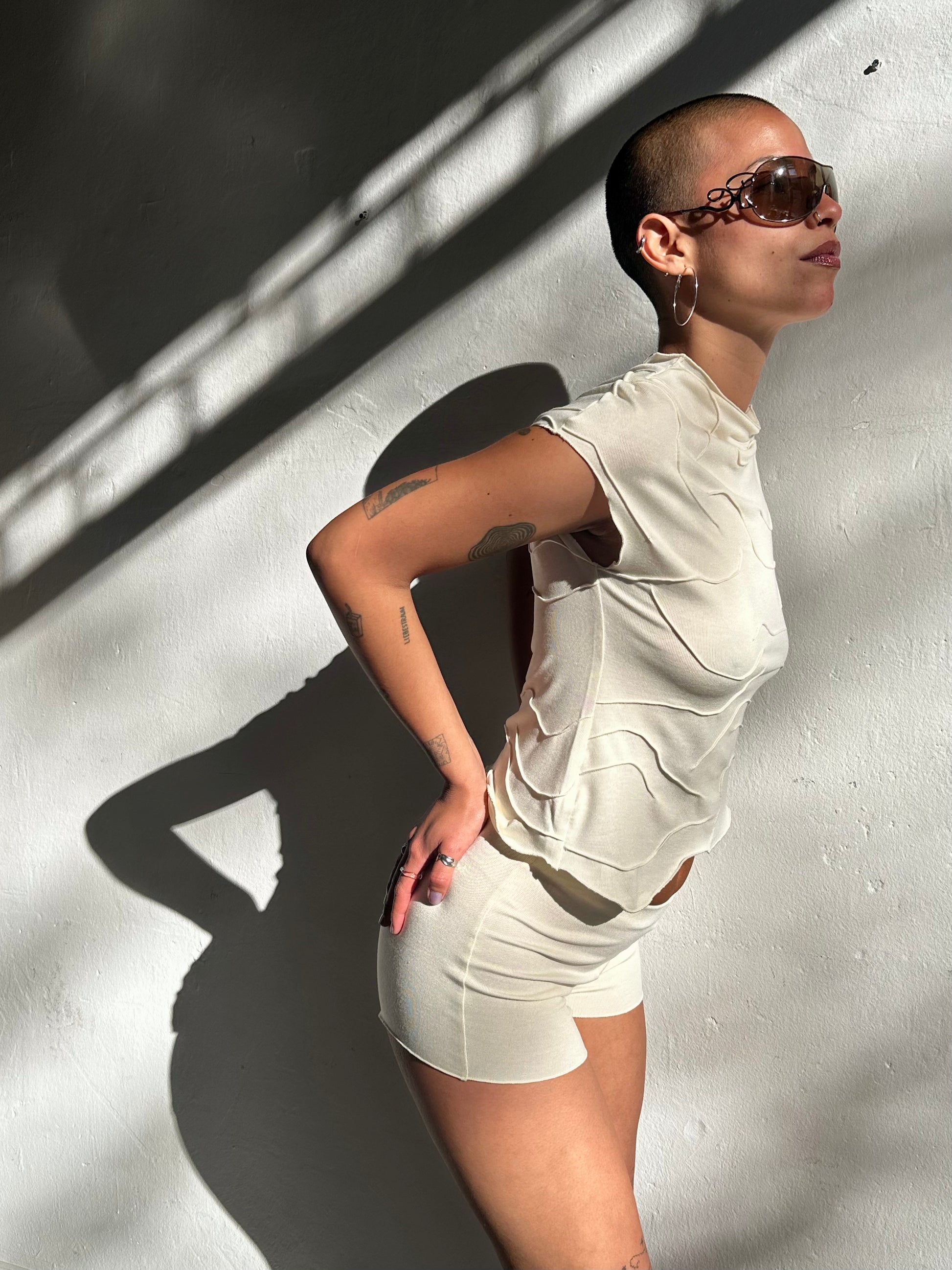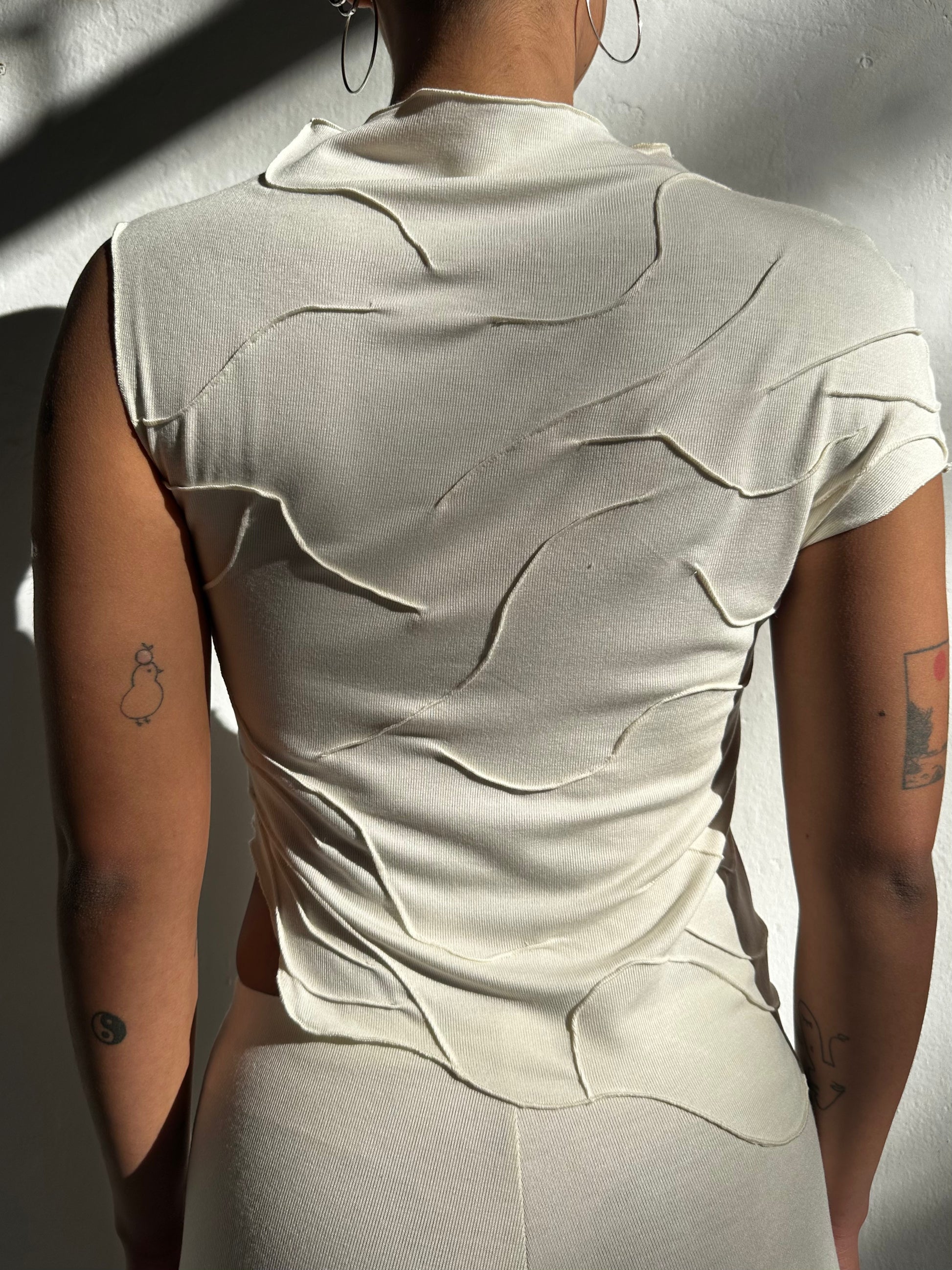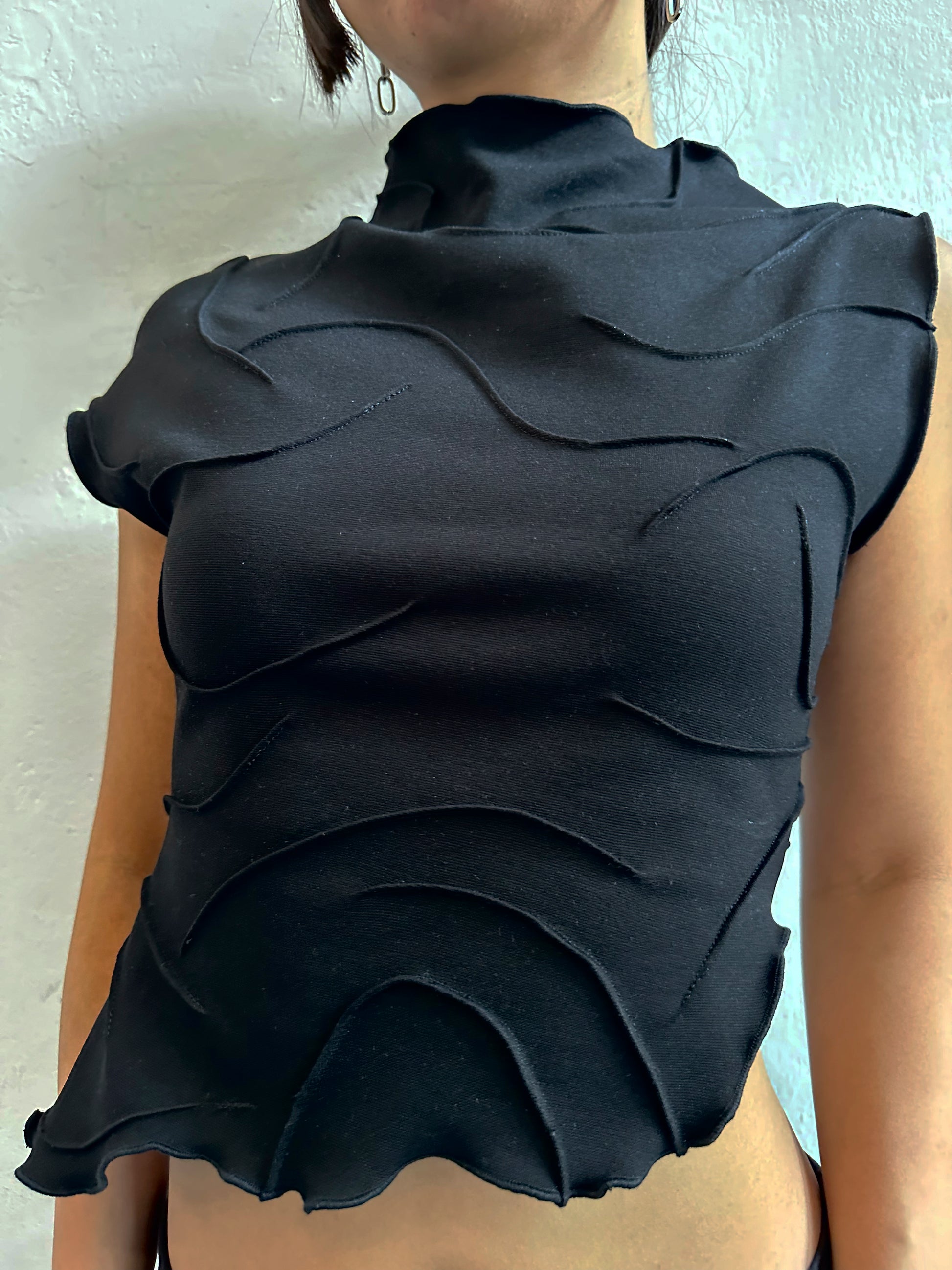 Black/ off-white asymmetric top featuring embossed seams crafted from ribbed jersey, locally sourced in Berlin. Each piece is unique so embossed seams may vary.
