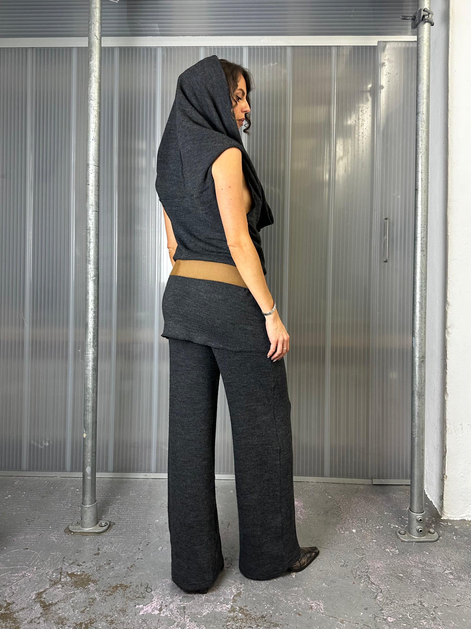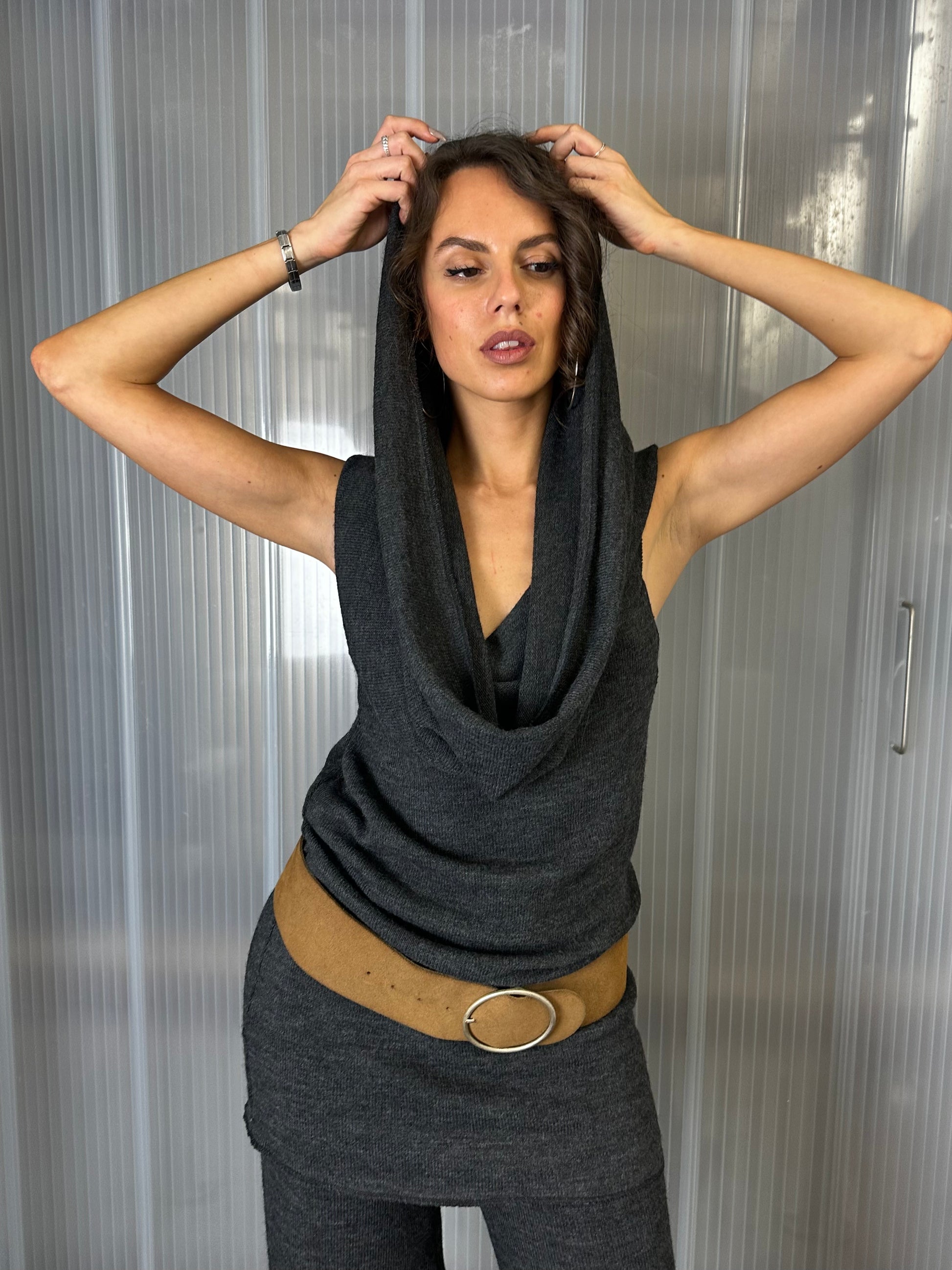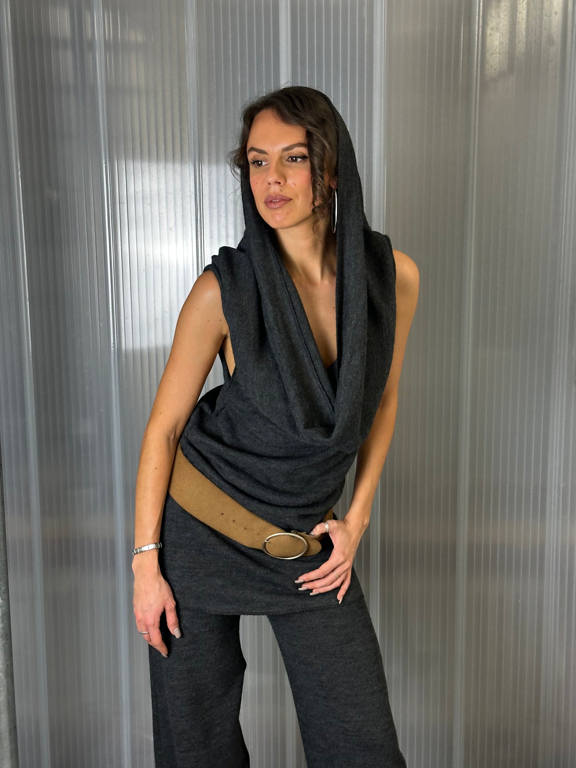 Umbra is a wool hooded dress made for city walks, night outs and shadow rituals. Mysterious yet minimal, it features a fluid neckline that adapts to your mood — wear it off-shoulder, draped or with the hood up. Crafted from stretchy wool locally sourced in Berlin, it’s both versatile and warm. Style it over our Moss capri pants or layer it your own way, it moves with you.