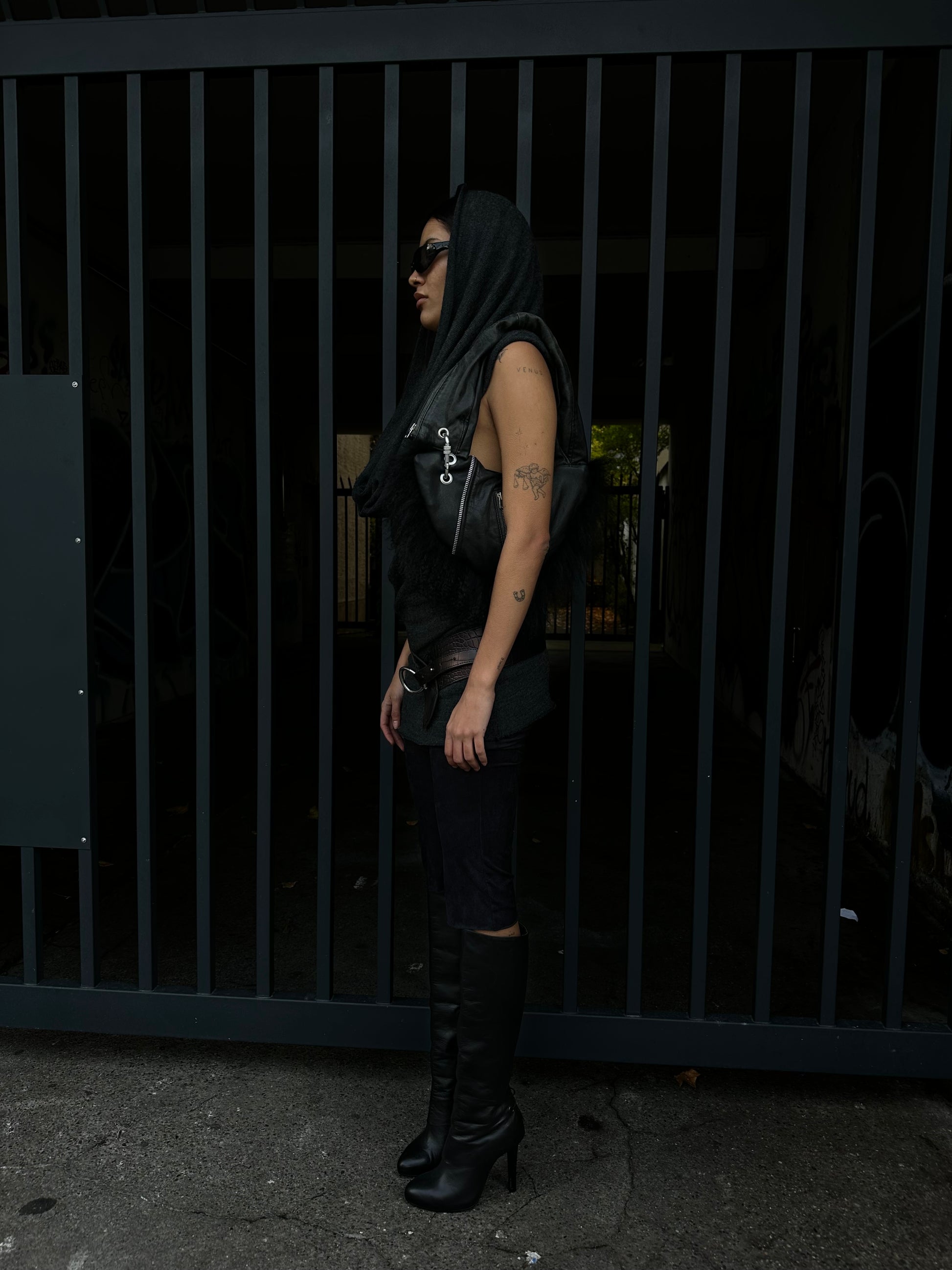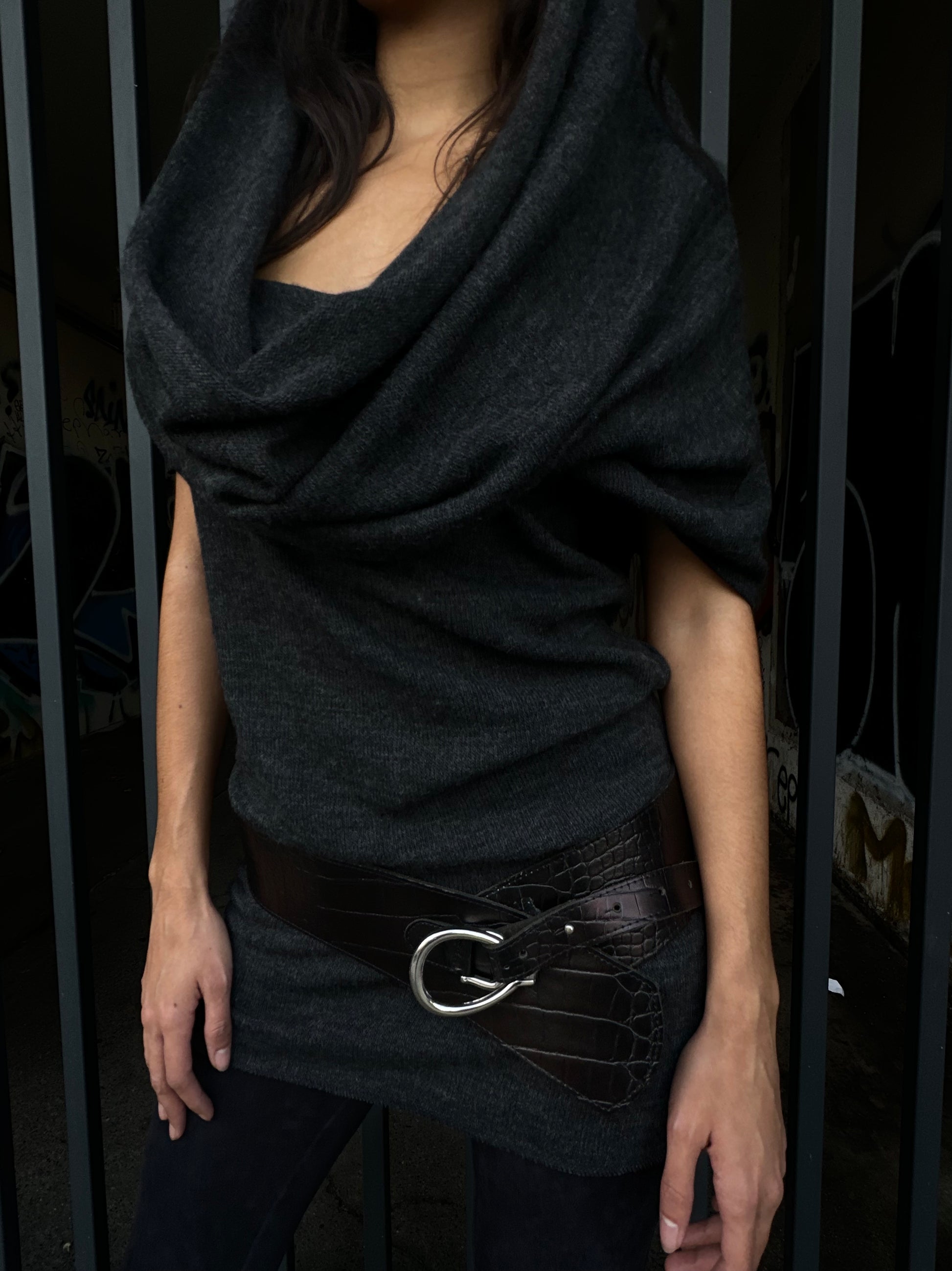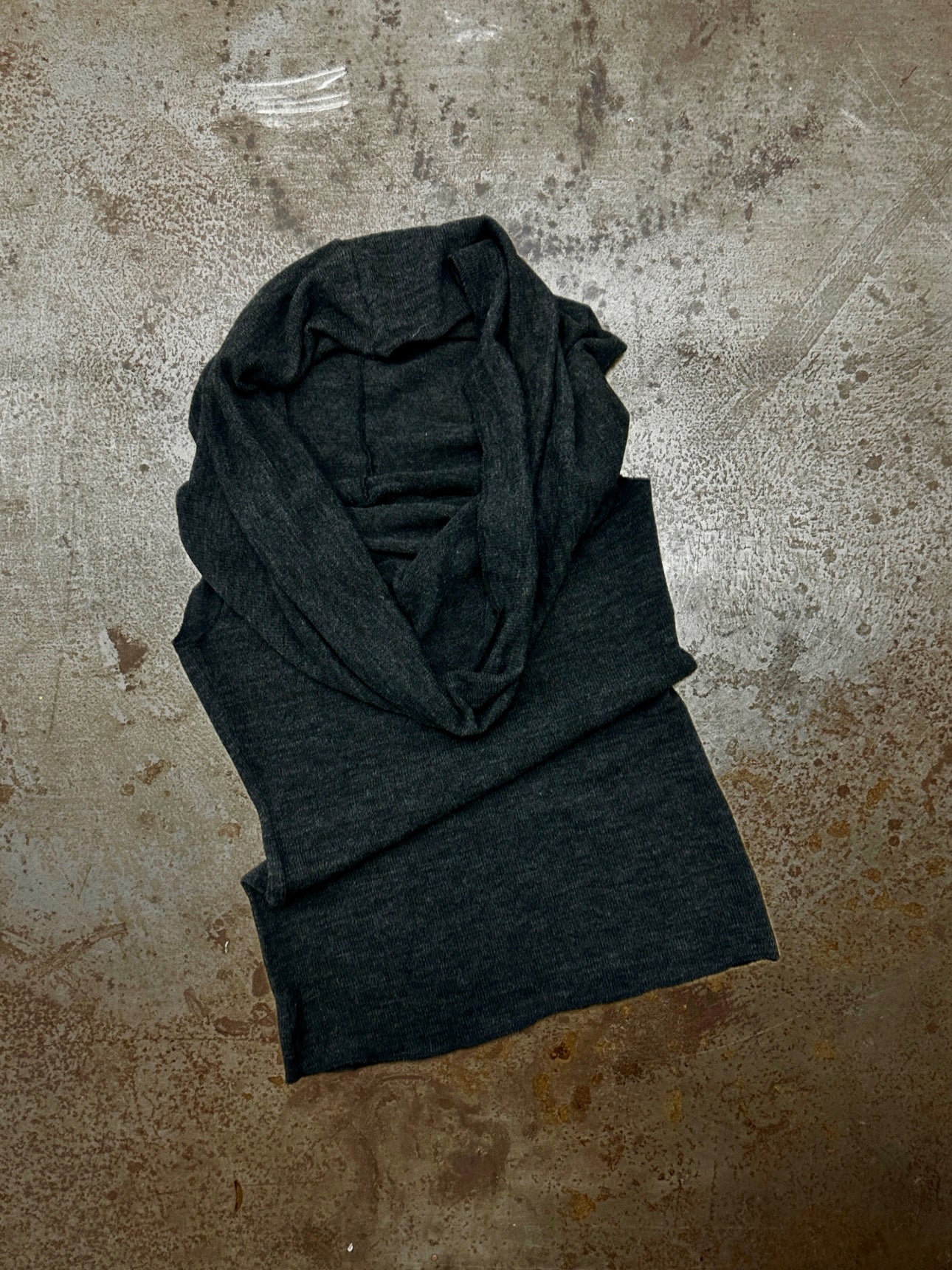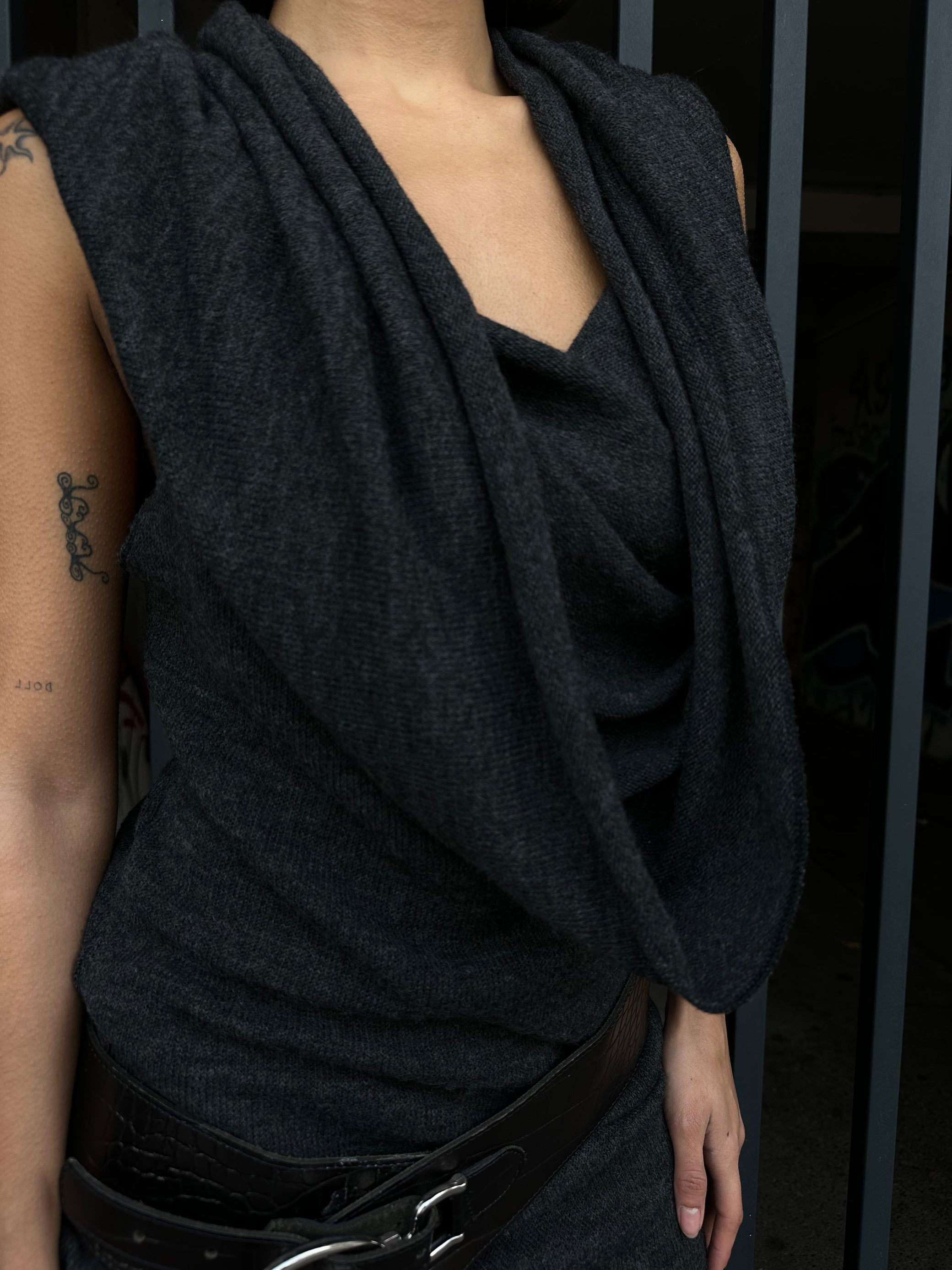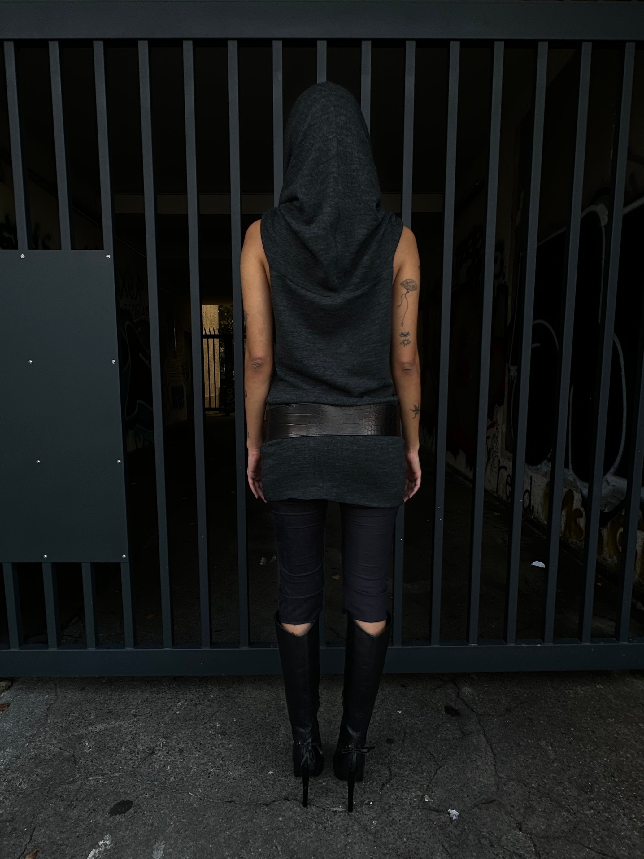Umbra is a wool hooded dress made for city walks, night outs and shadow rituals. Mysterious yet minimal, it features a fluid neckline that adapts to your mood — wear it off-shoulder, draped or with the hood up. Crafted from stretchy wool locally sourced in Berlin, it’s both versatile and warm. Style it over our Moss capri pants or layer it your own way, it moves with you.
